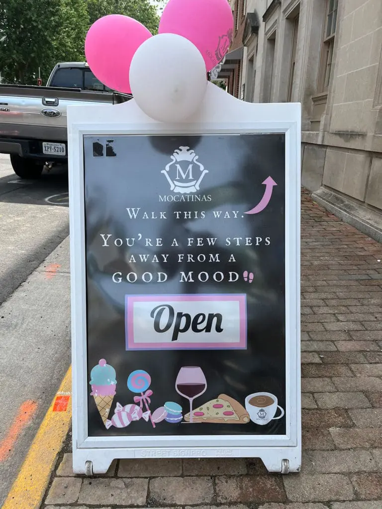 Depending on which way you approach Mocatinas, you’ll start to see some balloons, flags, and easel signs outside notifying you of special events including free cotton candy?!