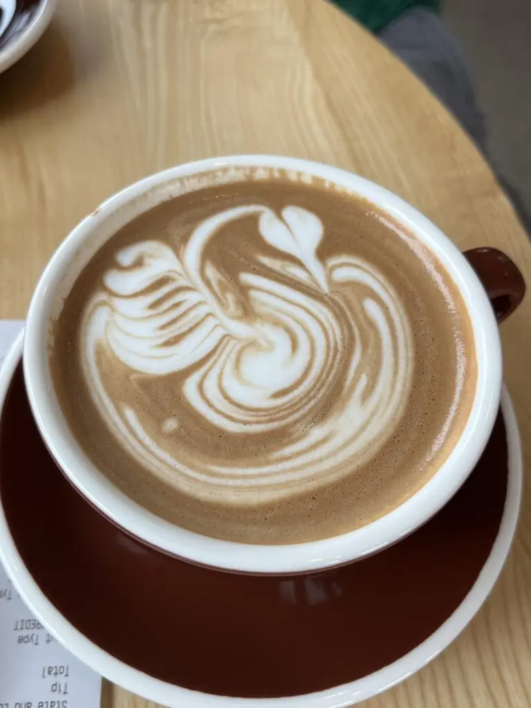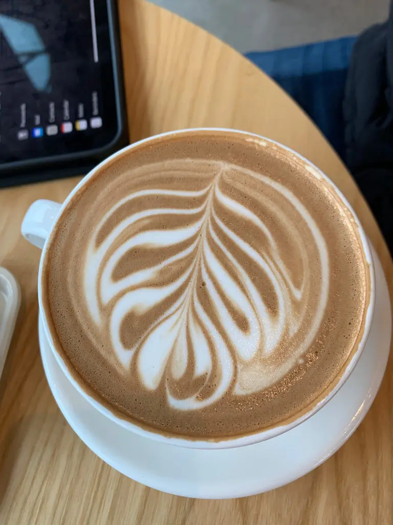 After a few minutes, Xak heard his name called and he went to the counter to retrieve our order. As he walked slowly back with two mugs and saucers, I grabbed the tray with food and carried it back to our small round table. The muffin and pastry had been warmed, and our coffee was adorned with latte art. We collected our respective treats and dug in.