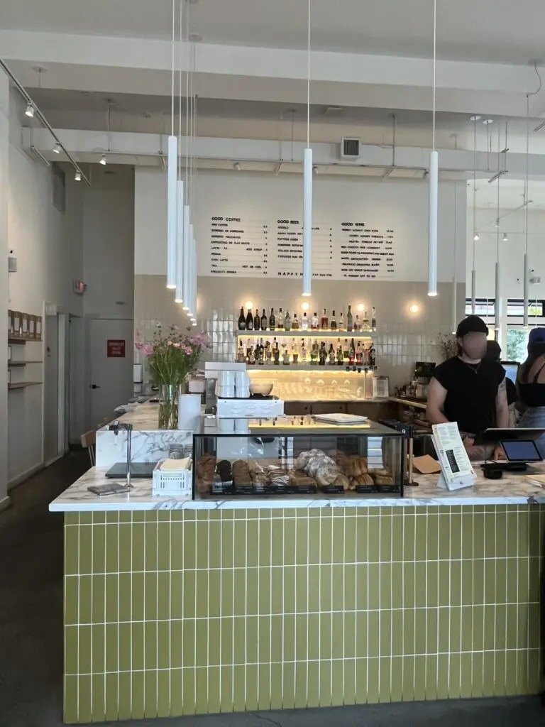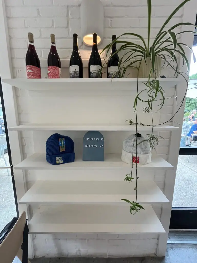 The coffee shop is very bright with walls of windows and modern with high open ceilings. There was merchandise for sale including beanies and wine. Green plants and flowers decorated the counters and shelves.