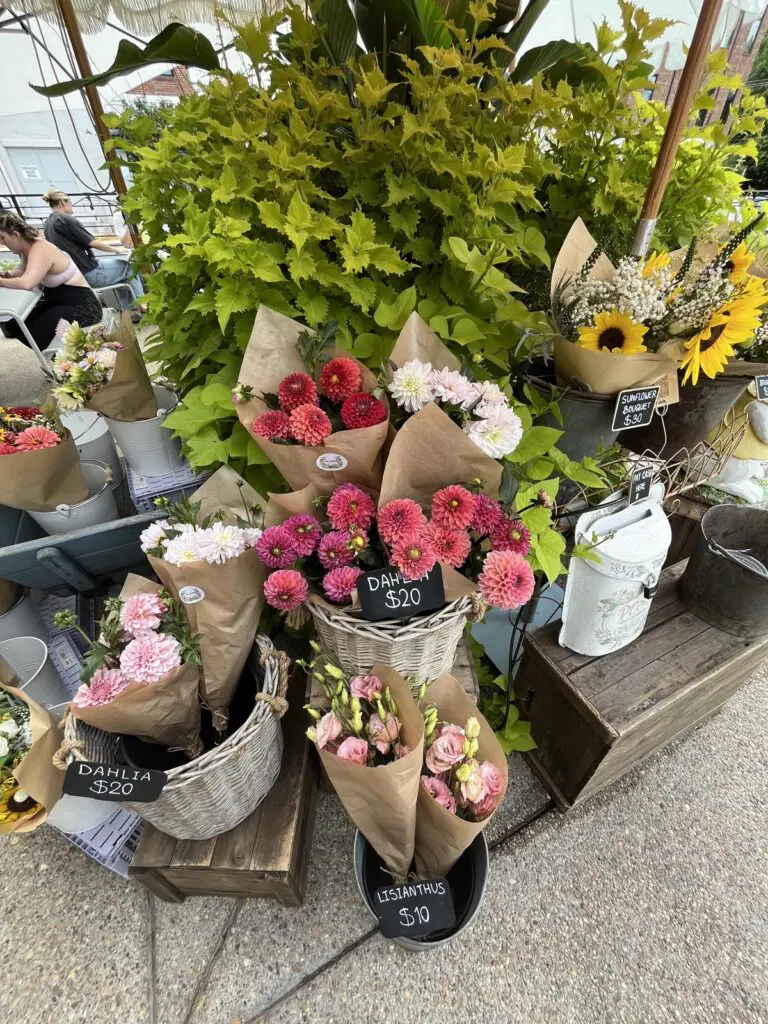 After returning our tray and throwing out our trash, we headed outside so I could check out the flowers I saw through the window from my table. Several people had opted to enjoy their coffee in the pleasant weather, and in the center of the patio was the pop up flower shop with beautiful dahlias on display.