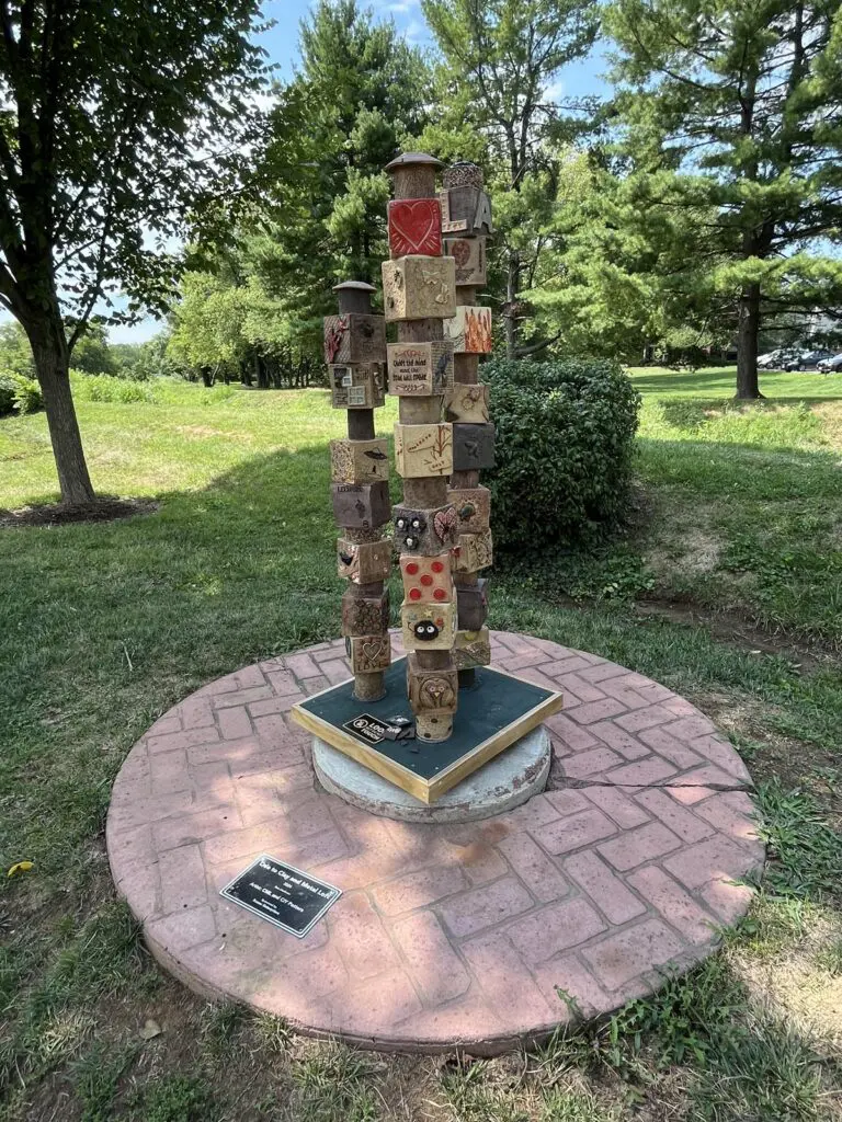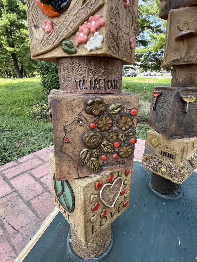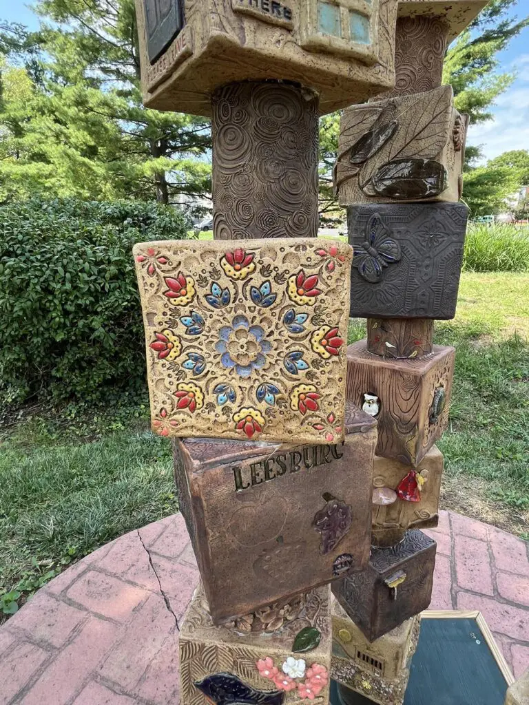 Although I appreciate how accessible the art is to the public, I also worry about things like out of control soccer balls breaking off pieces of the sculptures. However, everything looked to be in tact and it was nice we could walk directly up to each sculpture to inspect the crazy amount of detail in each piece. In particular, I appreciated the variety of handcrafted tiles and blocks that comprised one of the sculptures, called “Ode to Clay and Metal Loft” which I found out was a collaboration of many artists from The Clay and Metal Loft which has since left Leesburg.