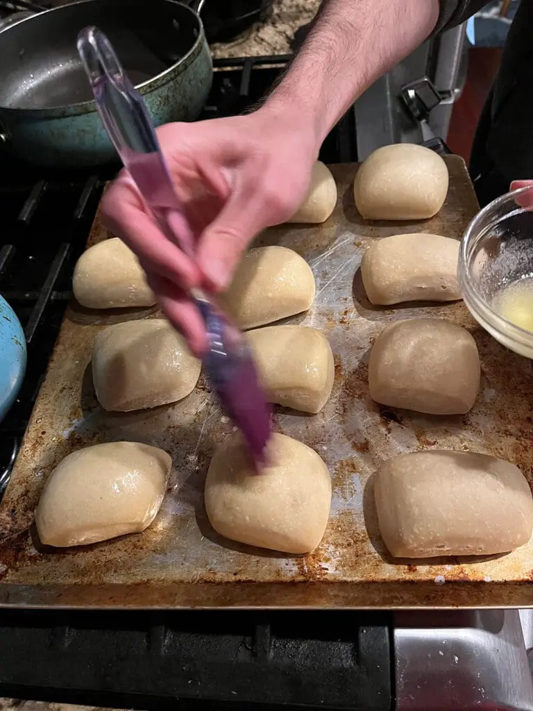 Glistening rolls emerging from the oven, ready to be dumped into the bread basket.