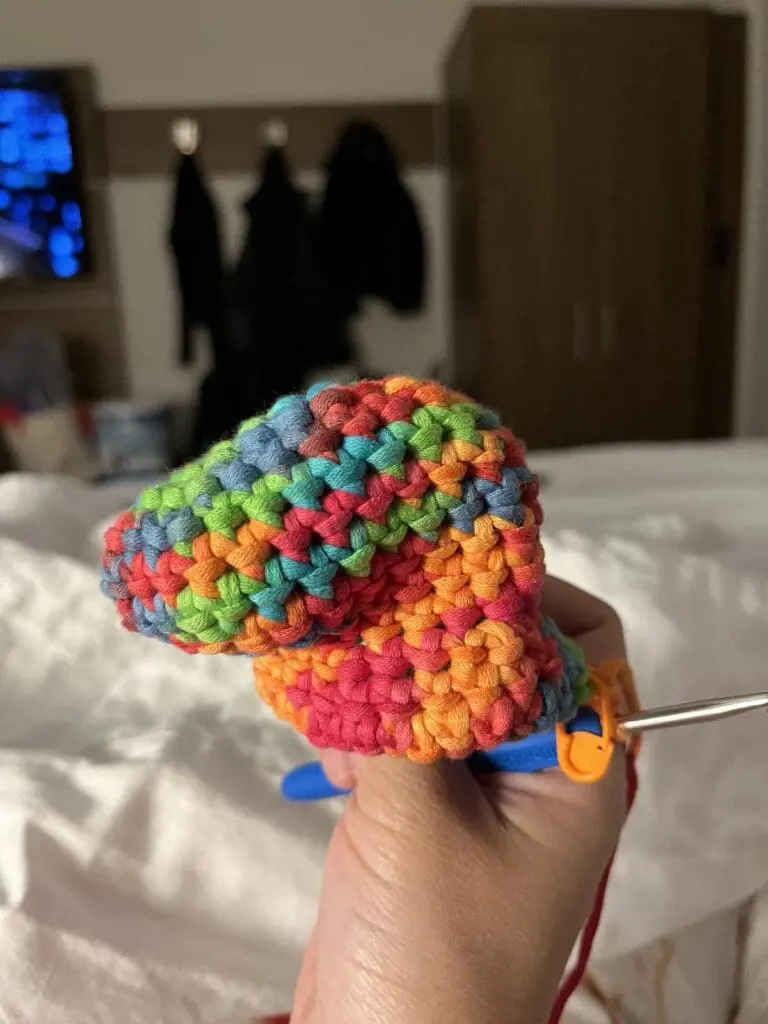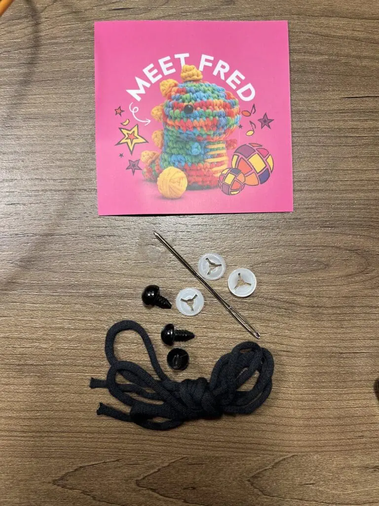 Since the main goal was to make sure Fred was more than a ball of yarn by the time we saw Eddie, I opened up the shiny Disco Fred package and laid out the materials to see what I would be working with. Inside the kit included rainbow yarn (soon to be Fred 🤞), yellow yarn, stuffing, a cardboard envelope, and the ergonomic crochet hook I had to buy in order to get my kit on time.
