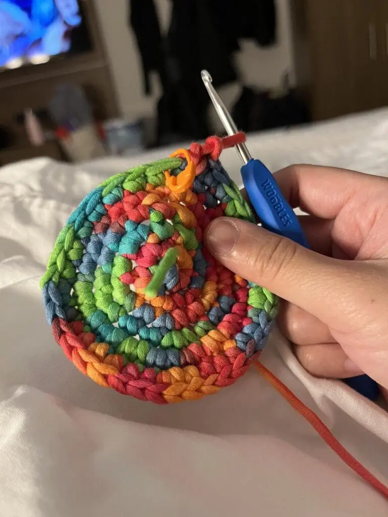 As Shark Tank blared on the 42″ hotel TV in the background (I told you, we love this show!), I started to worry that maybe I would be giving Eddie a round coaster for Christmas. However, I continued to crochet following the instructions. Since I was familiar with single crochet (the main stitch needed for this project), I realized I really just needed to follow the pattern.