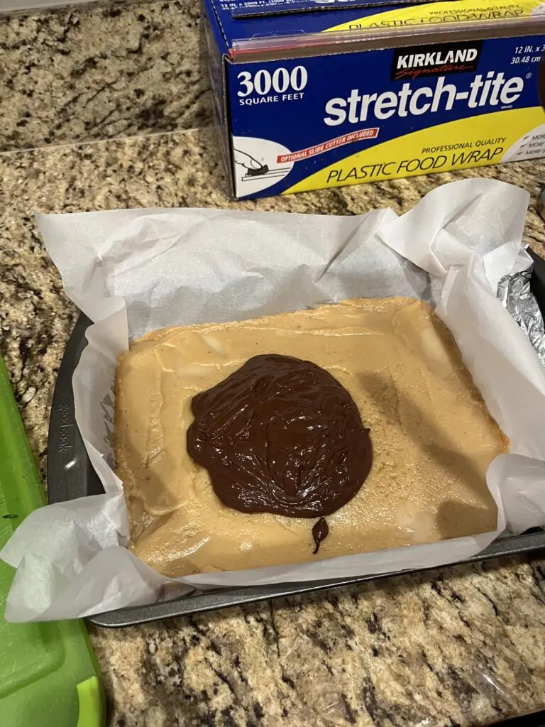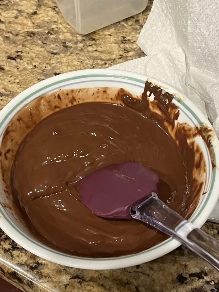 As I dutifully microwaved the bowl 4 times (as suggested in the recipe), pourable chocolate was beginning to form. For the last step, pouring the chocolate ontop of the caramel level and then refrigerate it.