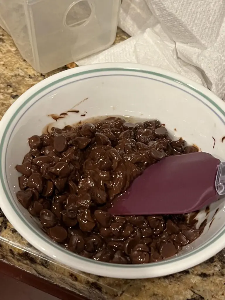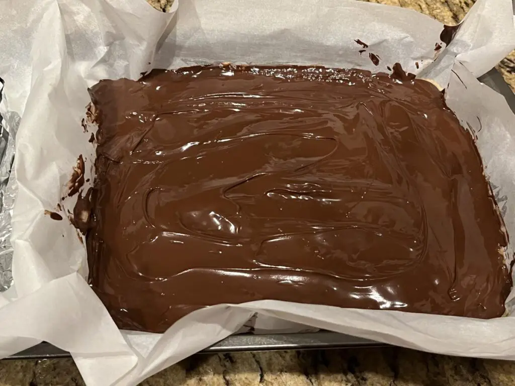Any time I make a recipe with chocolate chips, I always ensure there are enough chocolate chips for both the actual dessert and for me to do several rounds of taste testing. However, unlike cracker candy where you use solely chocolate chips, this recipe calls for mixing chocolate chips with vegetable oil in the microwave to soften. The thought of eating a spoonful of oil and chocolate chips doesn’t sound too appealing so we were in no danger of me sneaking in a few bites.