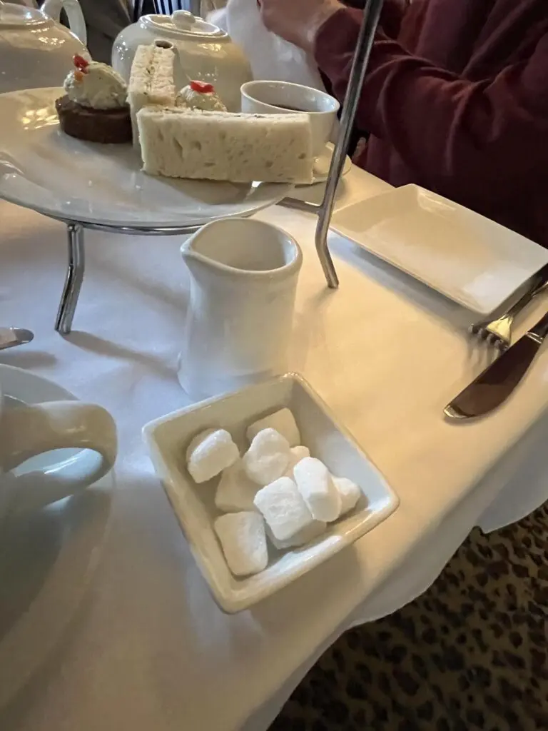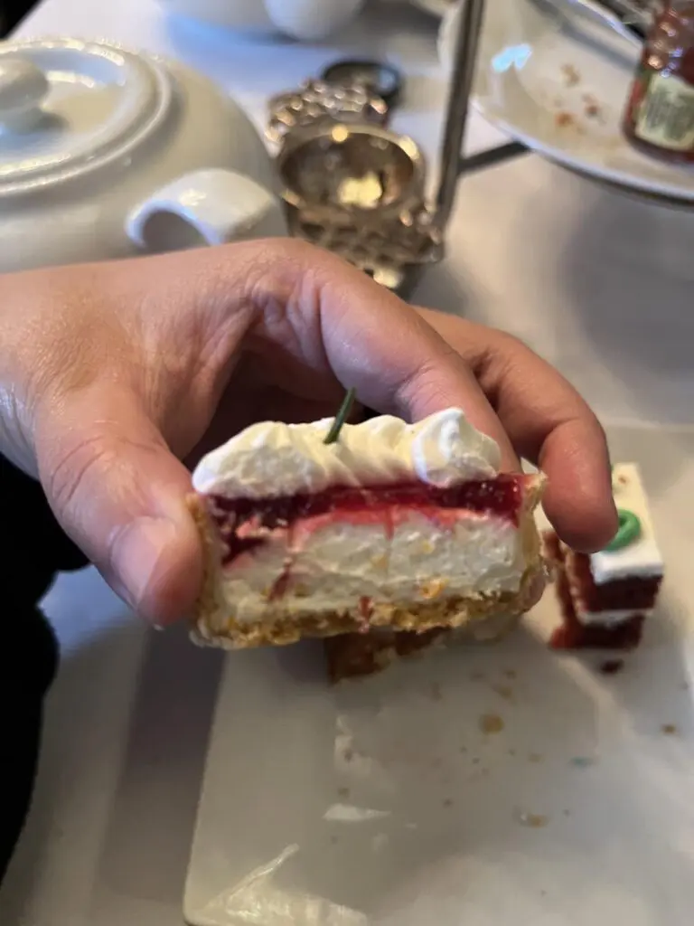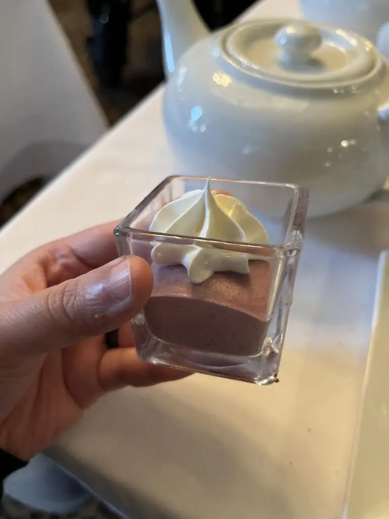 The final dessert was the sugar plum mousse. “Sugar plum” was really mixed berries. Since there was only one little cup, Xak and I passed it between us to grab a spoonful each. There wasn’t really a strong flavor and it was seedy from the berries. It seemed more appropriate for a summery themed tea tray vs a winter tea. While not my favorite dessert, this could have been great if it was offered as a palette cleanser in between courses. Also, what a missed opportunity to call it “Sugar plum berry mousse” (get it? like sugar plum fairy 😄).