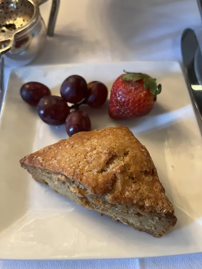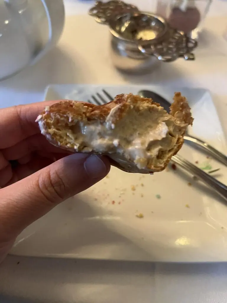 For a peach cobbler scone though, I wasn’t really sure what to expect. We previously had peach scones at afternoon tea before, but what makes something “cobbler”? The scone was served as a triangle with some sparkling sugar. Upon smelling it, I couldn’t really detect the peach. One of the reasons why I’m not a fan of triangular scones is because I can never rip them open without feeling like a 3 year old.