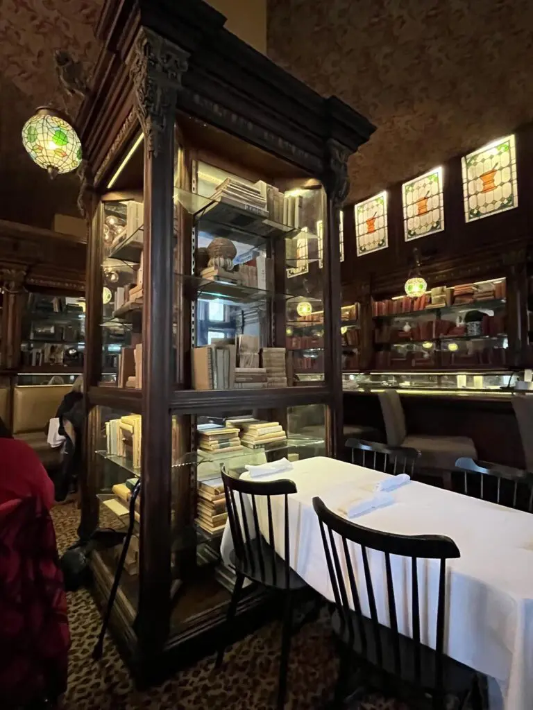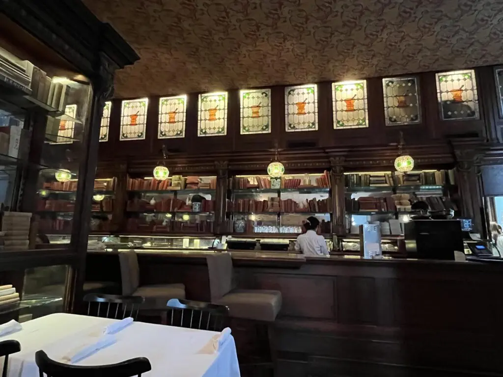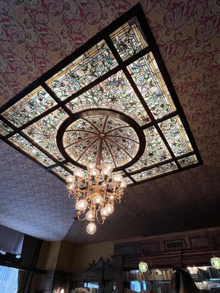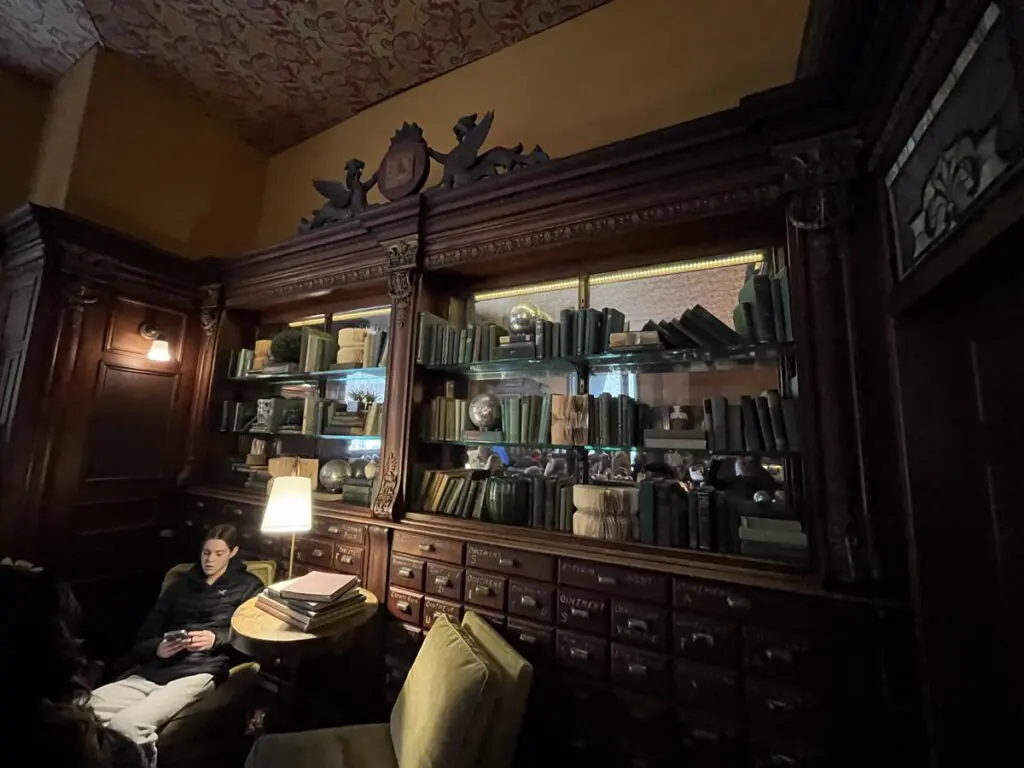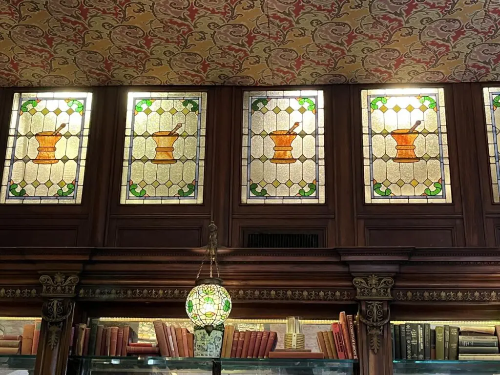 There was an enormous paneled chandelier in the center of the patterned ceiling along with smaller Tiffany style pendant lights lining the row of bookshelves and the bar. The windows above the bar area also had what looked like the pharmacy’s original stain glass featuring a mortar and pestle.