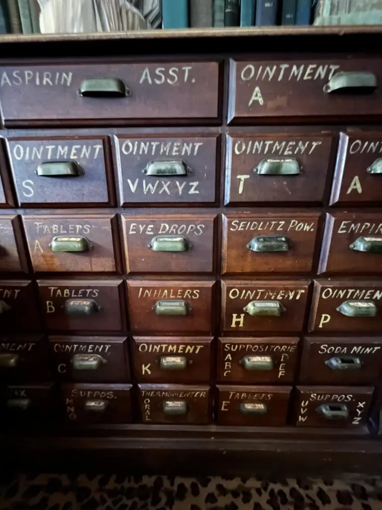 Before operating as a cafe and tea room, the building was originally used as a Solomon’s Pharmacy for several decades. Inside the building, remnants of Solomon’s still reside in the current environment, providing some of the most unique decor I’ve seen in a tea room.