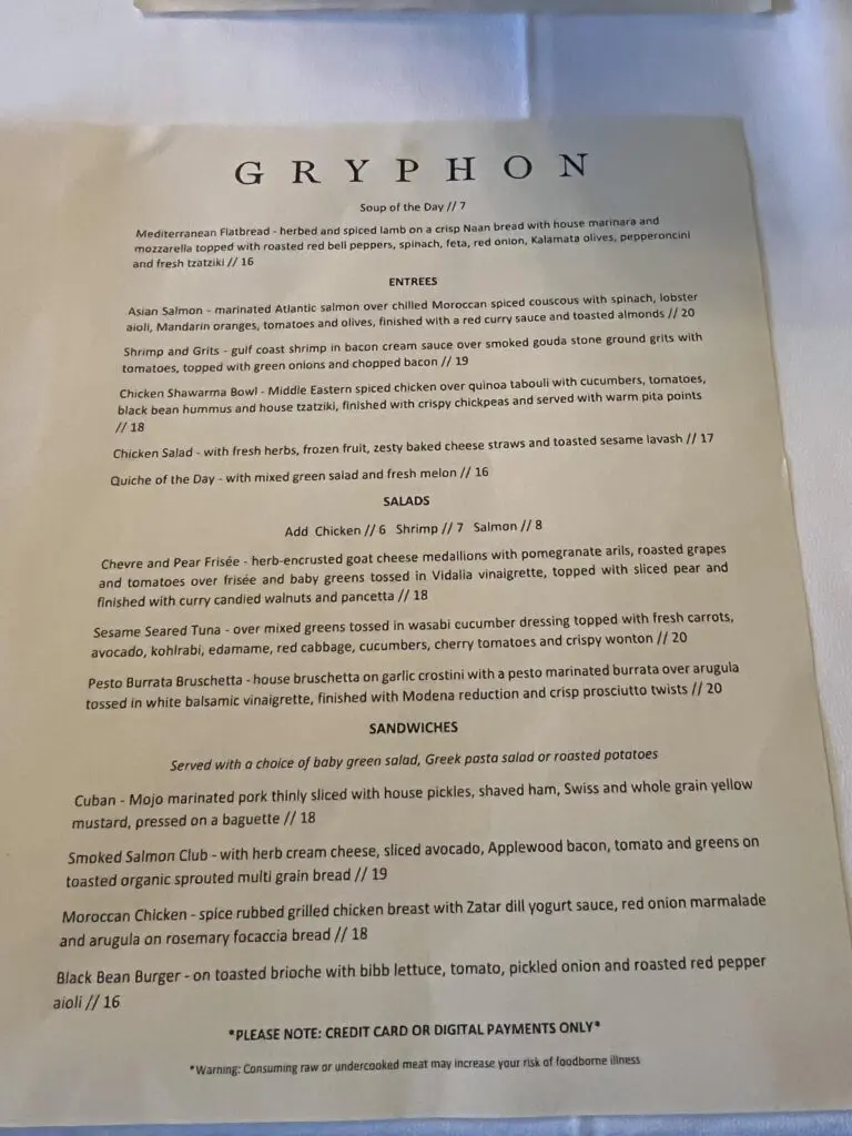 Since Gryphon is a cashless facility (stated on the website and the menu), we paid using a credit card via a payment machine that was brought to our table. Including a 20% tip, our bill was around $60~.
