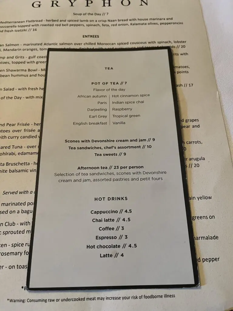 There were two menus: one for food and one for tea or hot beverages with specialty drinks listed on the other side.