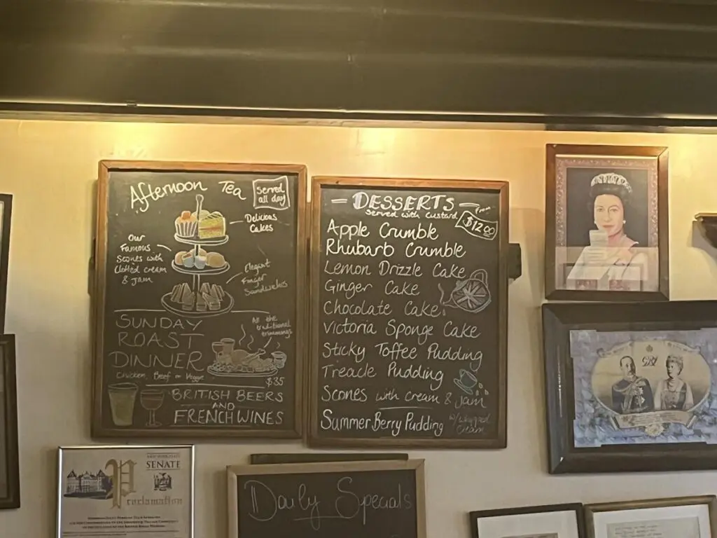 The tea room is quite tight, but has enough tables for quite a few small parties. The walls were filled with British themed artwork hung askew on the walls, chalkboards with menu items, and several dishes on display. Almost every square inch of space was filled.