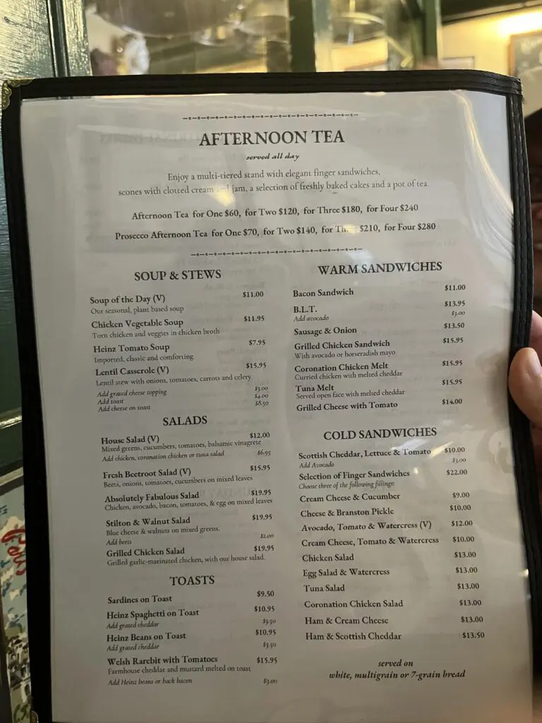 When we were first looking into Tea and Sympathy, the website menu had stated that afternoon tea was $50 per person (Note from Dani: this was in June 2024). During our actual visit however, the physical menu said afternoon tea was $60 per person and I noticed that this change has been updated on the website as I’m writing this in August 2024. $60 is on the mid to upper end for tea places that we typically visit. Less than the hotels, but more than most of the normal tea rooms. This price is in line with what I’d expect for the location and the popularity of the brand.