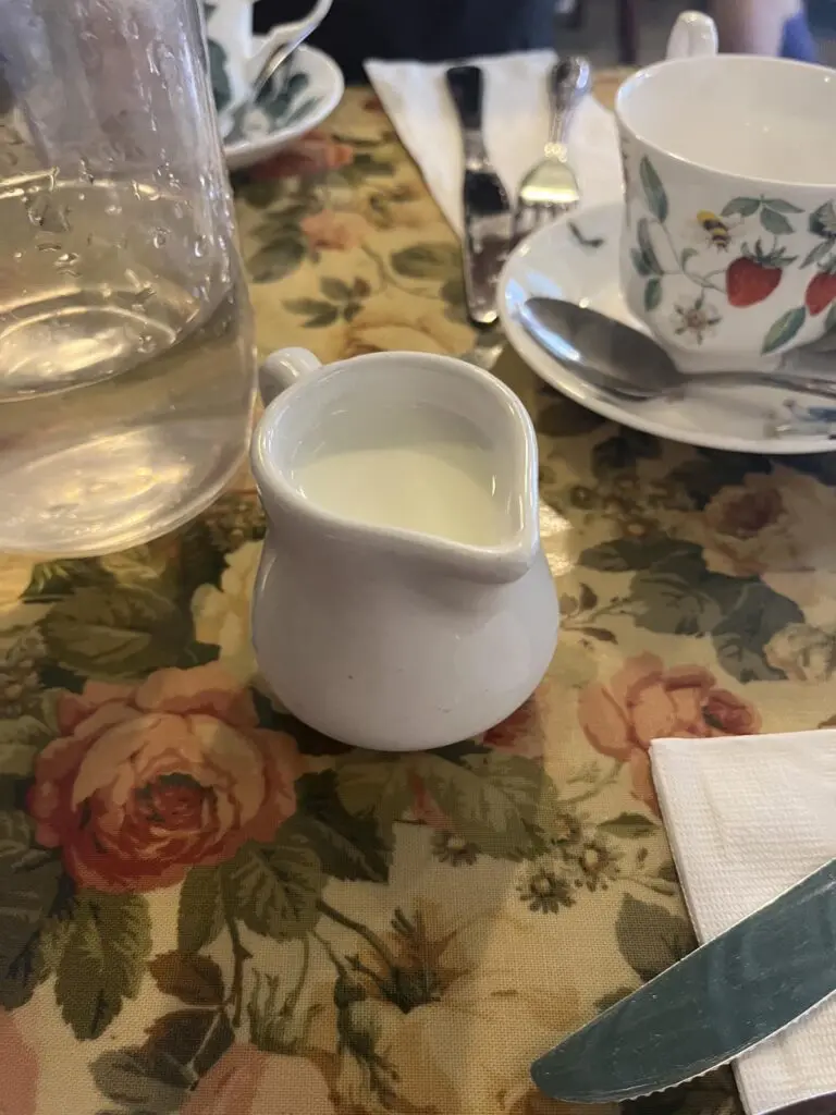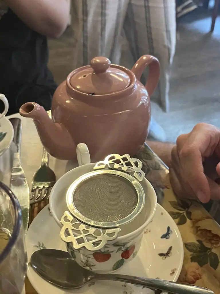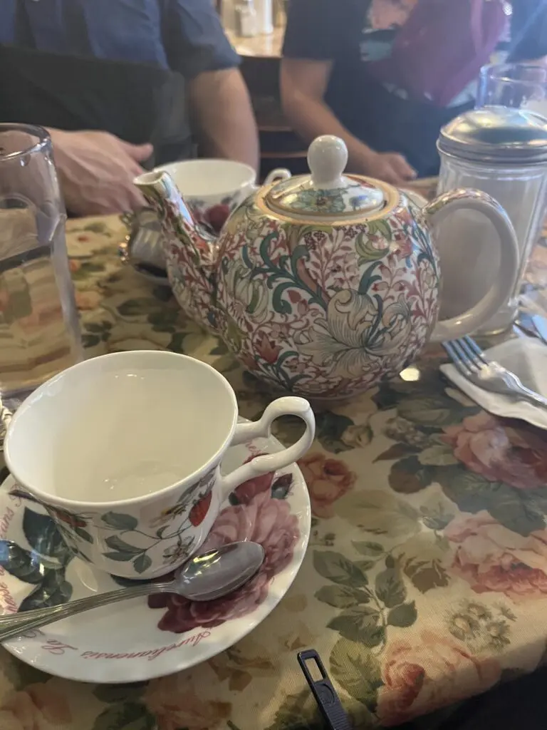 Our table was set with a flowered patterned tablecloth, silverware, salt and pepper, and granulated sugar in a shaker (no sugar cubes 😞). Our server brought us glasses and a large container of water, which disappeared nearly immediately. After informing the server we would be ordering tea, our table was soon filled with tea strainers, teacups and saucers and teaspoons. I was a little concerned because our table was quite full and we hadn’t received any food yet.