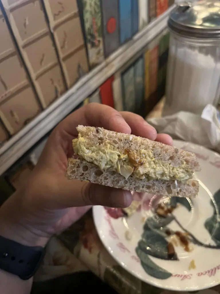 The Coronation chicken sandwich is one of Xak’s first tea sandwiches ever, served at the Grand Floridian at Disney World. Sadly we don’t seem to have this too much in other tea rooms, and I wish it was more common here in the states. The name comes from the food originally being prepared as part of the Coronation banquet for Queen Elizabeth II in 1953. Coronation chicken typically has curry powder and dried herbs and spices and you can see why it’s one of my favorites. All three of us enjoyed it, although again it would have benefited from different bread. I would love to make this one for a future tea at home (on different bread).