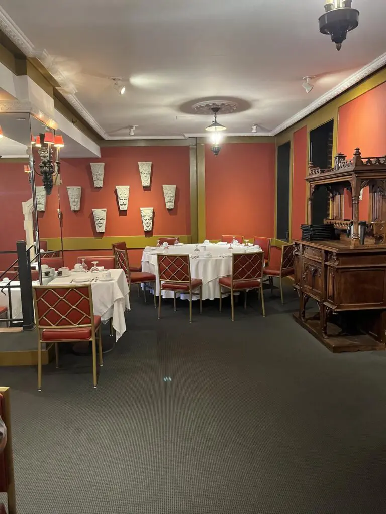 This room contained more set tables of various sizes split between two levels, mirrors and wall art, but again no other guests. Xak and I chose a two person table next to the exit door.
