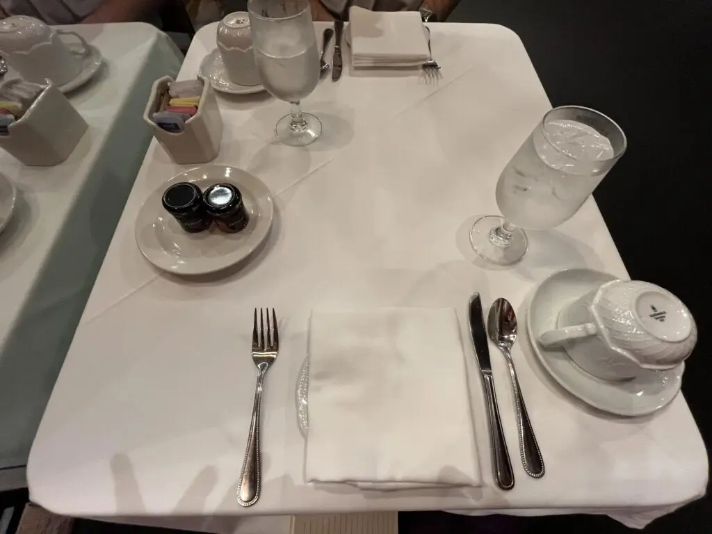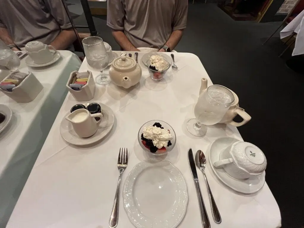 The table had been set with teacups, glasses of water, silverware, plates, two small jars of Dickinson’s jams (likely for the scones) and cloth napkins on a white tablecloth.