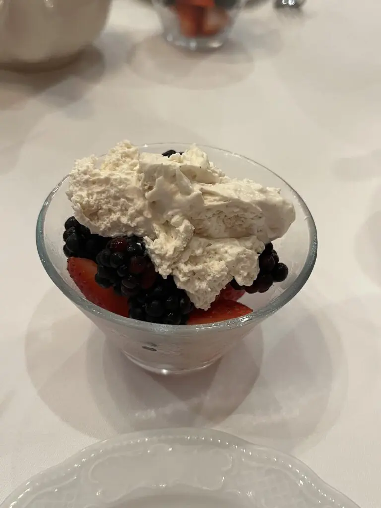 After making our selections, the meal started with a chilled bowl of fresh mixed berries including strawberries and blackberries with a large amount of whipped cream which put a large smile on whipped cream loving Xak’s face. Although I do not share Xak’s love for whipped cream, I do love fresh fruit so I took a big bite of the fruit with a much smaller amount of whipped cream than Xak. Surprisingly, the whipped cream had a pleasant vanilla bean flavor which went well with the fruit. It was a very nice way to start the meal.