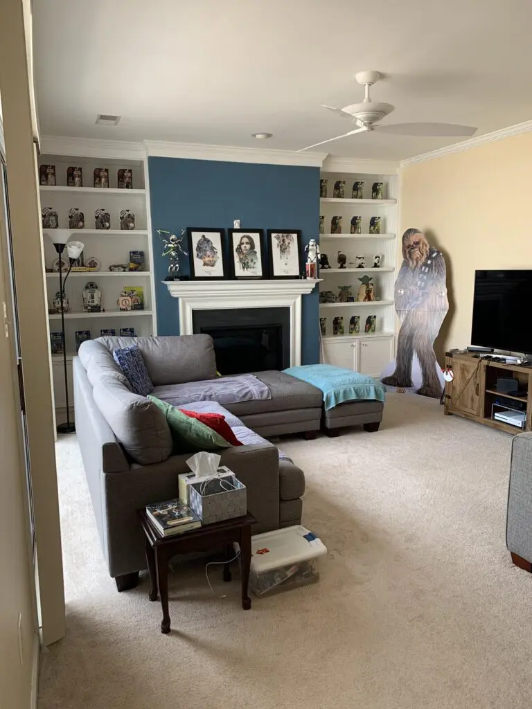 I spent quite a long time researching how to display the Falcon. I was especially interested in mounting it on the wall until I saw a Reddit post where someone’s beloved ship was in 7591 pieces on the floor. After realizing I wouldn’t be able to deal with that kind of stress, I finally settled on purchasing a specially made stand and setting it in the front of the room. I gave Xak the incredibly stressful task of transferring the Falcon over from the dining room to its new home. After what felt like an hour of me holding my breath, it was up and it looked perfect.