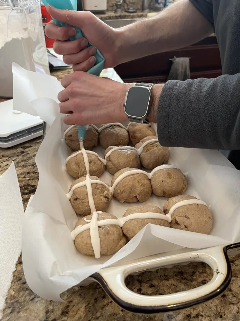 Ever since Xak and I tried grocery store discounted bakery hot cross buns (on sale after Easter), he’s been on the hunt for the best hot cross bun recipe. While the basic recipe consists of similar ingredients (spices and fruit), the biggest variation is usually found in the glaze and the cross itself.